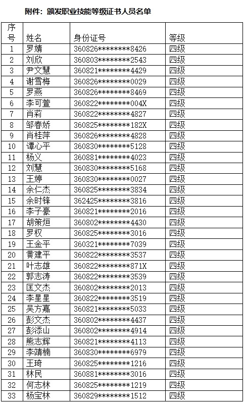 根據《江西省人力資源和社會保障廳關于遴選備案職業(yè)技能等級認定社會培訓評價組織的通知》(贛人社字(2020)302號)、(贛人社字(2022)128號)文件要求。按照《關于開展“互聯(lián)網+職業(yè)技能等級認定”試點工作的通知》(贛人社字(2020)397號)精神。我校于2024年11月25日開展了電子商務師(網商)等級認定,共37人(四級),通過認定考核33人。現對認定考核合格人員進行公示(名單附后)。