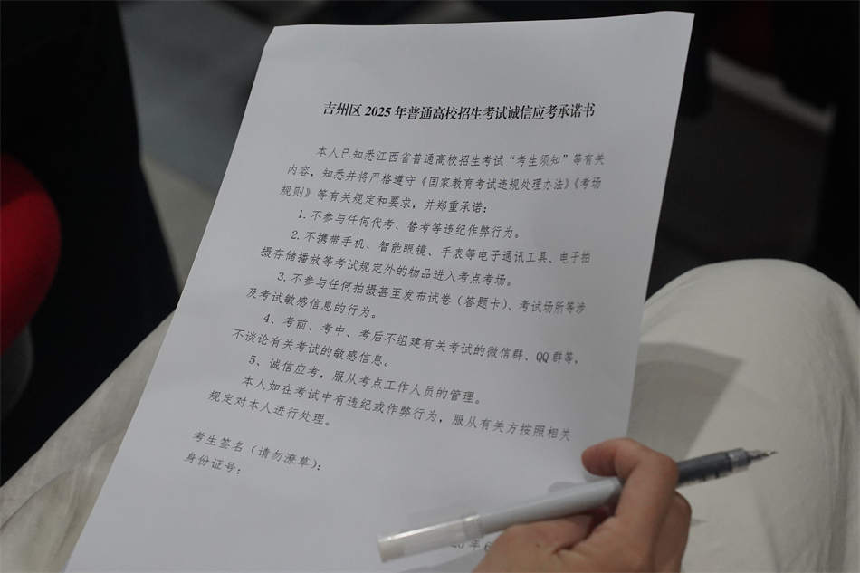 此外,學(xué)校還組織全體考生簽署了《吉州區(qū)2025年普通高校招生考試誠(chéng)信應(yīng)考承諾書》。大家在承諾書上鄭重簽名,承諾將嚴(yán)格遵守考試紀(jì)律,誠(chéng)信應(yīng)考,以實(shí)際行動(dòng)維護(hù)高考的公平公正。