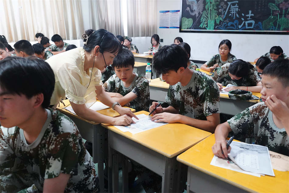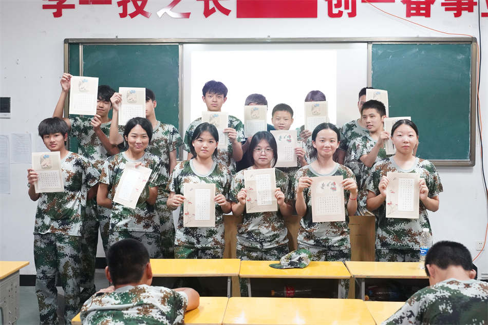 訓(xùn)練場上,教官正逐個糾正學(xué)員的敬禮手勢:“手腕再平一點,目光看向前方!”課間休息時,他卻微笑著遞上礦泉水:“今天比昨天進步多了,繼續(xù)保持!”教室里,書法課的老師正俯身查看學(xué)生臨寫的硬筆楷書作業(yè),提出建議:“注意橫畫起筆要像刀刻般利落,收尾時筆尖順勢輕提。”這種嚴慈相濟的指導(dǎo),讓學(xué)員們在適應(yīng)節(jié)奏的同時,也感受到成長的溫度。