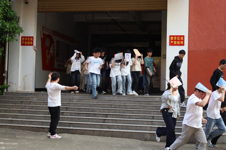 與此同時(shí),在樓道、樓梯轉(zhuǎn)角等易發(fā)生擁擠踩踏的關(guān)鍵位置,疏散引導(dǎo)組老師早已就位。主震信號(hào)結(jié)束后,“緊急疏散”指令下達(dá),教學(xué)樓內(nèi)學(xué)生在班主任指引下,按照“先低層后高層、靠右行走”的原則快速撤離。引導(dǎo)老師不斷提醒:“不要擁擠!注意腳下!護(hù)住頭部!”學(xué)生們彎腰低姿,用書本保護(hù)頭部,沿預(yù)定路線向操場(chǎng)集結(jié)。