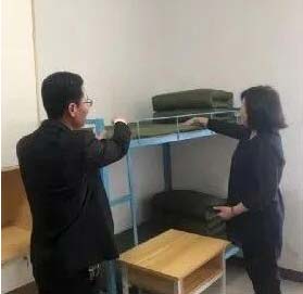 王菡處長認真檢查學生用的棉被