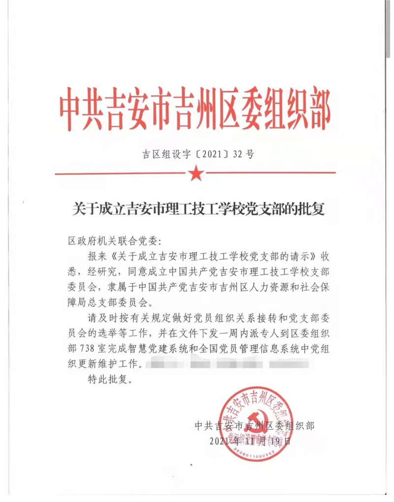 中共吉安市吉州區(qū)人力資源和社會保障局總支部委員總支書記周晶同志宣布了中共吉安市吉州區(qū)委組織部《關(guān)于同意成立中共吉安市理工技工學(xué)校支部委員會的批復(fù)》
