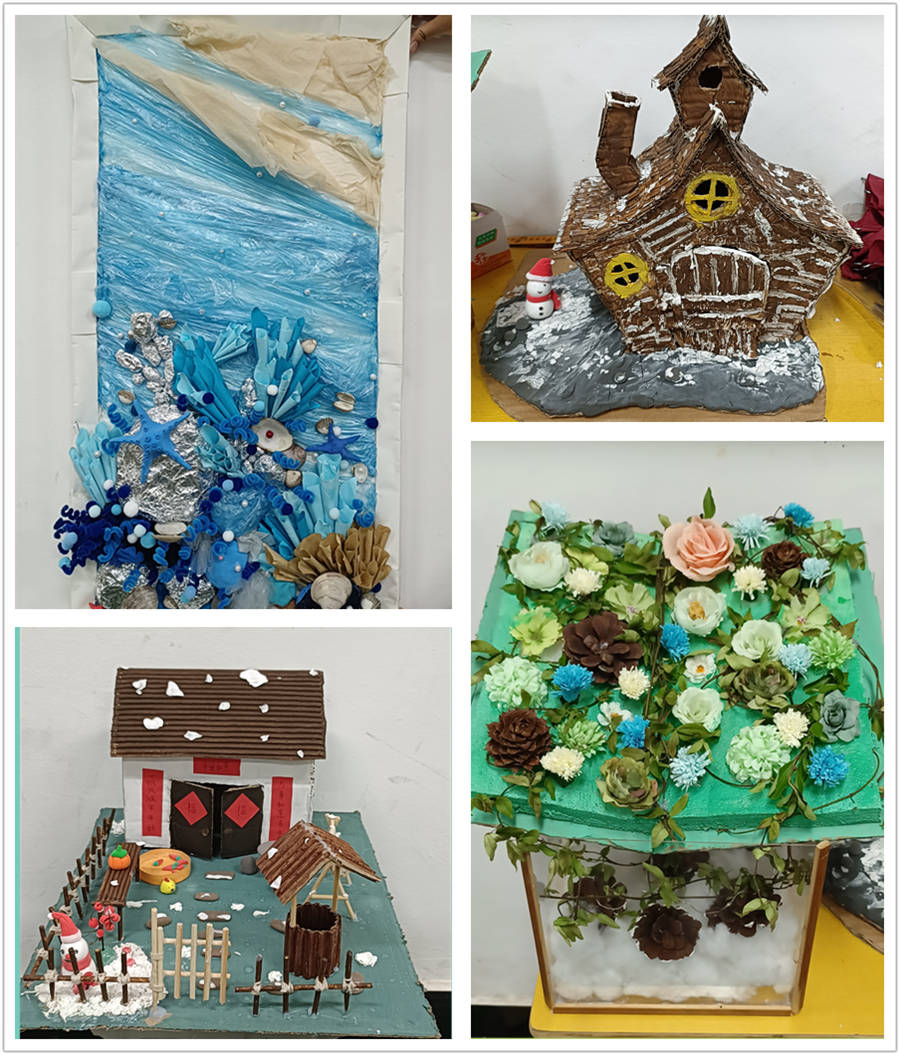 優(yōu)秀獎:歐陽昕手工作品《春之夢--百花齊放》;周詩瑩、朱倩手工作品《四季與景》;曾雯萍、歐陽芊手工作品《冬日小屋》;李靜手工作品《落葉的季節(jié)》