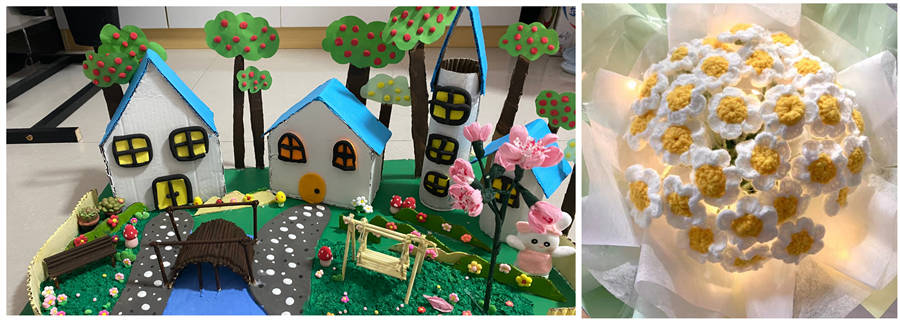 三等獎:周嬌、周雅琴手工作品《暖》;劉怡手工作品《洋甘菊花束》;邱寧艷、劉鑫手工作品《四季與“泥”》。