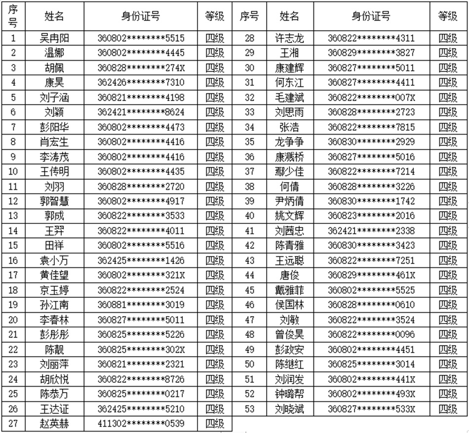 根據(jù)《江西省人力資源和社會(huì)保障廳關(guān)于遴選備案職業(yè)技能等級(jí)認(rèn)定社會(huì)培訓(xùn)評(píng)價(jià)組織的通知》(贛人社字(2020)302號(hào))、《江西省人力資源和社會(huì)保障廳關(guān)于公布江西省第二批職業(yè)技能等級(jí)認(rèn)定社會(huì)培訓(xùn)評(píng)價(jià)組織的通知》(贛人社字(2022)128號(hào))文件要求。按照《關(guān)于開(kāi)展“互聯(lián)網(wǎng)+職業(yè)技能等級(jí)認(rèn)定”試點(diǎn)工作的通知》(贛人社字〔2020〕397號(hào))精神。我校于2024年4月12日開(kāi)展了電子商務(wù)師(網(wǎng)商)等級(jí)認(rèn)定,共54人(四級(jí)),通過(guò)認(rèn)定考核53人?,F(xiàn)對(duì)認(rèn)定考核合格人員進(jìn)行公示(名單附后)。