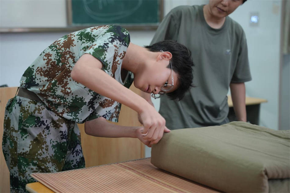 晨光中的初體驗(yàn):當(dāng)?shù)谝宦暺鸫蔡?hào)劃破寧?kù)o的校園,新生們從美夢(mèng)中醒來(lái),迅速整理起內(nèi)務(wù),他們或蹲或跪,手指在薄被上輕輕按壓,細(xì)心調(diào)整每一個(gè)褶皺,直到被子呈現(xiàn)出完美的棱角,被疊成棱角分明的“豆腐塊”,牙刷杯、毛巾整齊劃一地?cái)[放在洗漱臺(tái)上。這些看似微不足道的細(xì)節(jié),卻是軍訓(xùn)生活紀(jì)律性的最初體現(xiàn)。