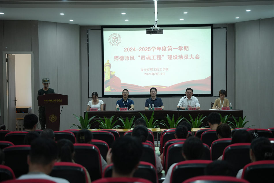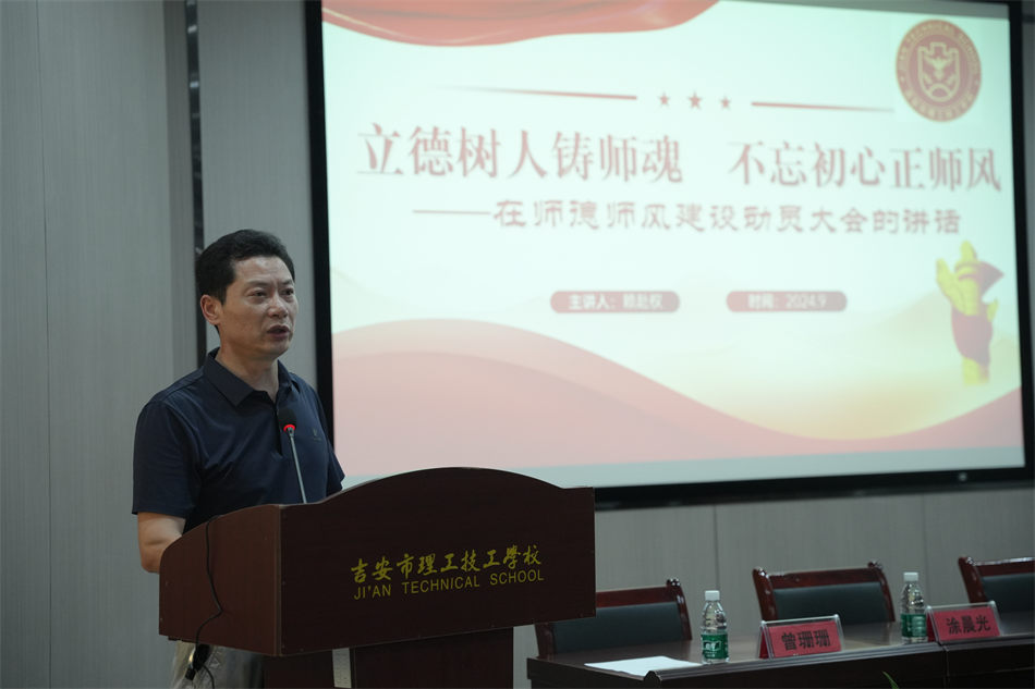 時(shí)維九月,序?qū)偃?。為了進(jìn)一步提高廣大教師的職業(yè)道德水平,為學(xué)生的健康成長(zhǎng)提供更好的教育環(huán)境,加快推動(dòng)學(xué)校教育事業(yè)健康發(fā)展,努力辦好人民滿意的教育,2024年9月4日,吉安市理工技工學(xué)校隆重地舉行了一場(chǎng)師德師風(fēng)“靈魂工程”建設(shè)動(dòng)員大會(huì)。會(huì)議由執(zhí)行校長(zhǎng)汪榮華主持。