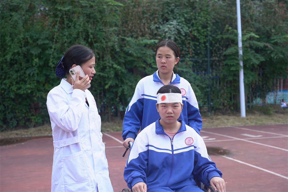 在演習(xí)過程中,防護(hù)救護(hù)組的成員也迅速行動(dòng),對(duì)模擬的受傷人員進(jìn)行了及時(shí)的救護(hù)。利用輪椅、醫(yī)藥箱等應(yīng)急設(shè)備對(duì)受傷人員進(jìn)行了初步處理,并撥打120電話請(qǐng)求專業(yè)醫(yī)療救援。