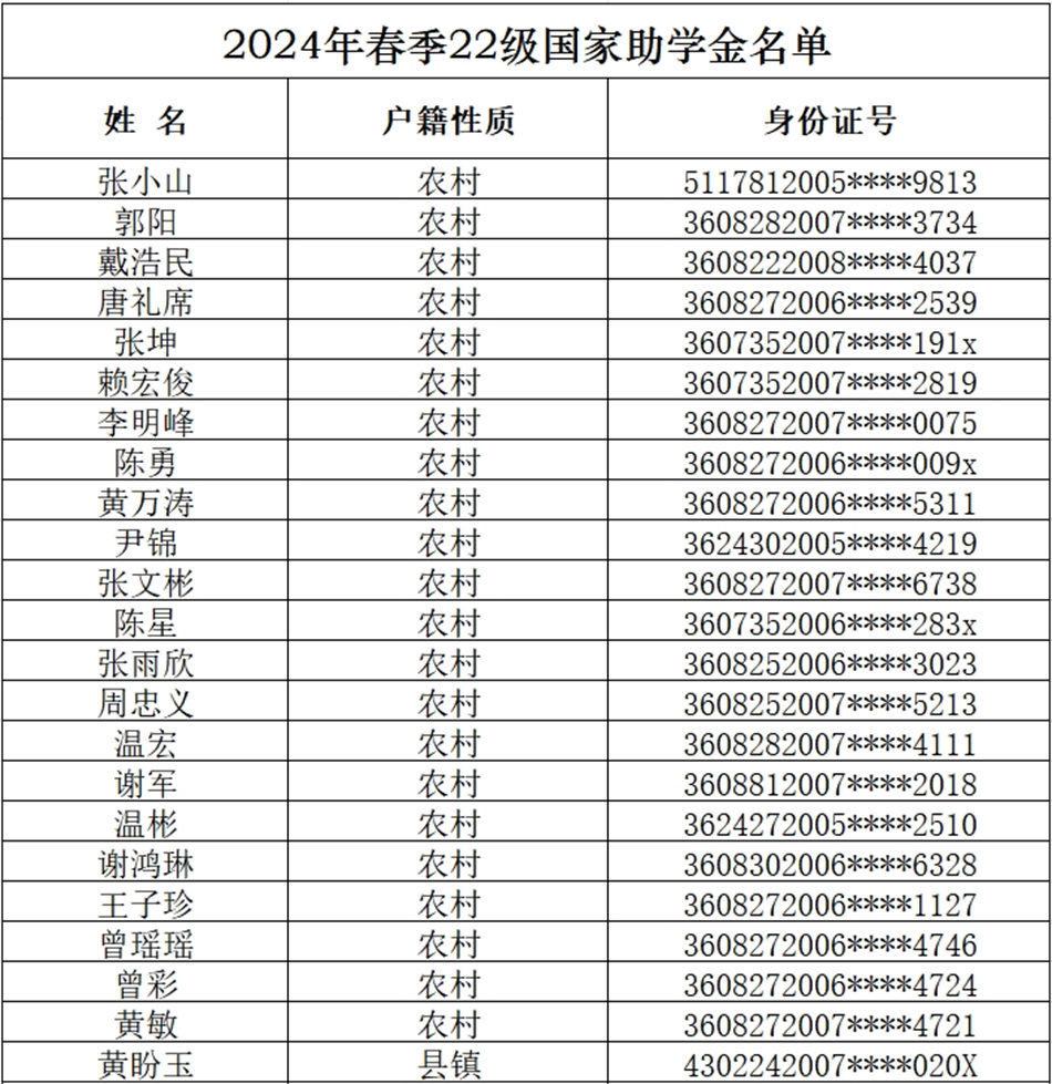 根據(jù)《吉安市理工技工學(xué)校2023-2024學(xué)年下學(xué)期家庭經(jīng)濟困難學(xué)生認定工作的通知》,現(xiàn)將學(xué)生家庭經(jīng)濟困難學(xué)生認定結(jié)果公示如下,如有疑問請于公示日期內(nèi)向校資助中心反映,公示日期為2024年04月09日至2024年04月14日。